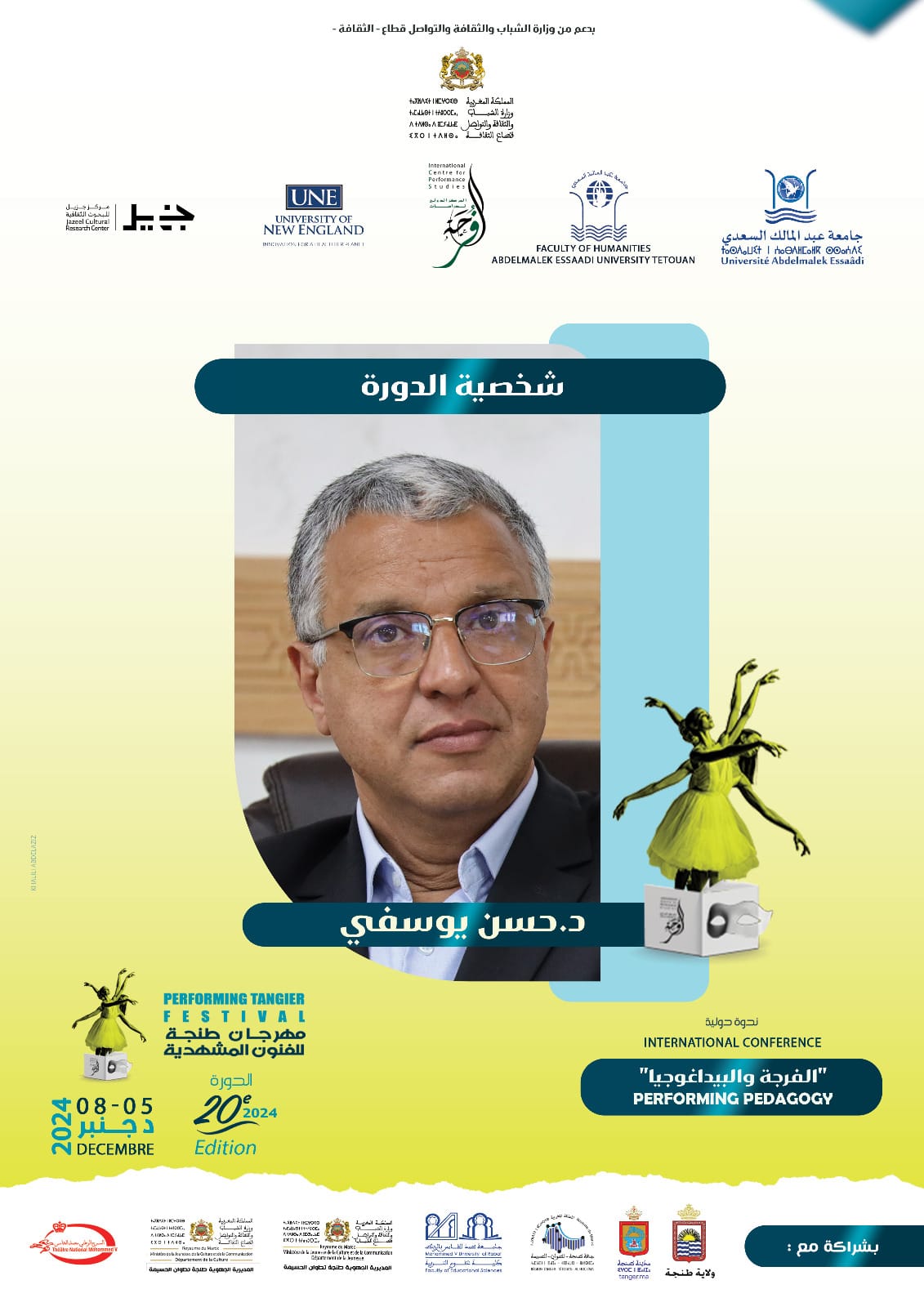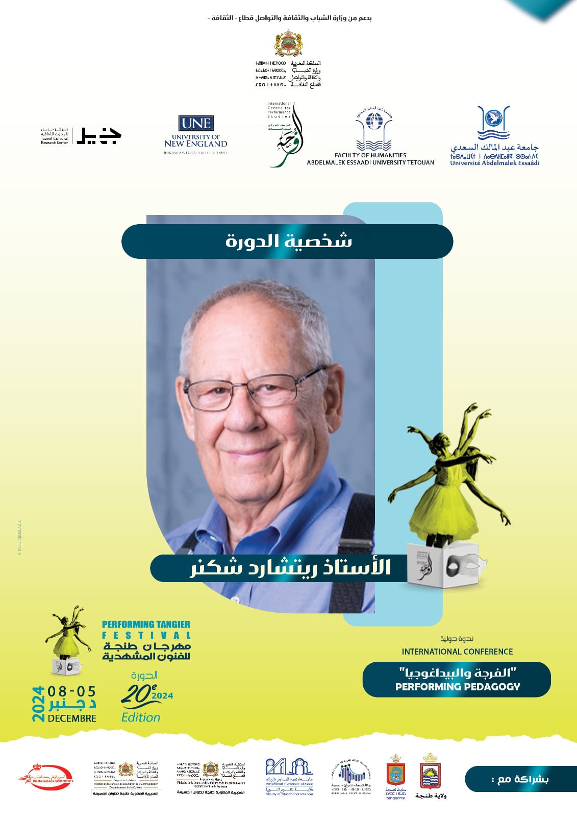 دورة هذه السنة، التي ستقدم لجمهور طنجة المشهدية قرابة عشرة عروض مسرحية/ أدائية، ومعرضين اثنين طيلة أيام المهرجان، تستضيف فنانين وباحثين ومفكرين من المغرب، تونس، مصر، السعودية، العراق، الكويت، بالإضافة إلى إيطاليا والبرتغال، وكذا إنجلترا وأمريكا..، لينضموا إلى طاولة نقاش “الفرجة والبيداغوجيا” التي ستتوزع على عشر جلسات علمية، وخمس محاضرات افتتاحية لمفكرين متخصصين ومرموقين، مع وقفة اعتراف تُعد من سُنن إدارة المهرجان، وهي تكريم شخصيتي الدورة العشرين، ويتعلق الأمر بكل من البروفيسور ريتشارد شِكنر من أمريكا، أول مؤسس لحقل لدراسات الفرجة في العالم، والباحث والناقد المسرحي الدكتور حسن يوسفي من الغرب أحد الفاعلين البارزين الأكاديميين في المشهد المسرحي. هذا بالإضافة إلى توقيع آخر إصدارات المركز الدولي لدراسات الفرجة.